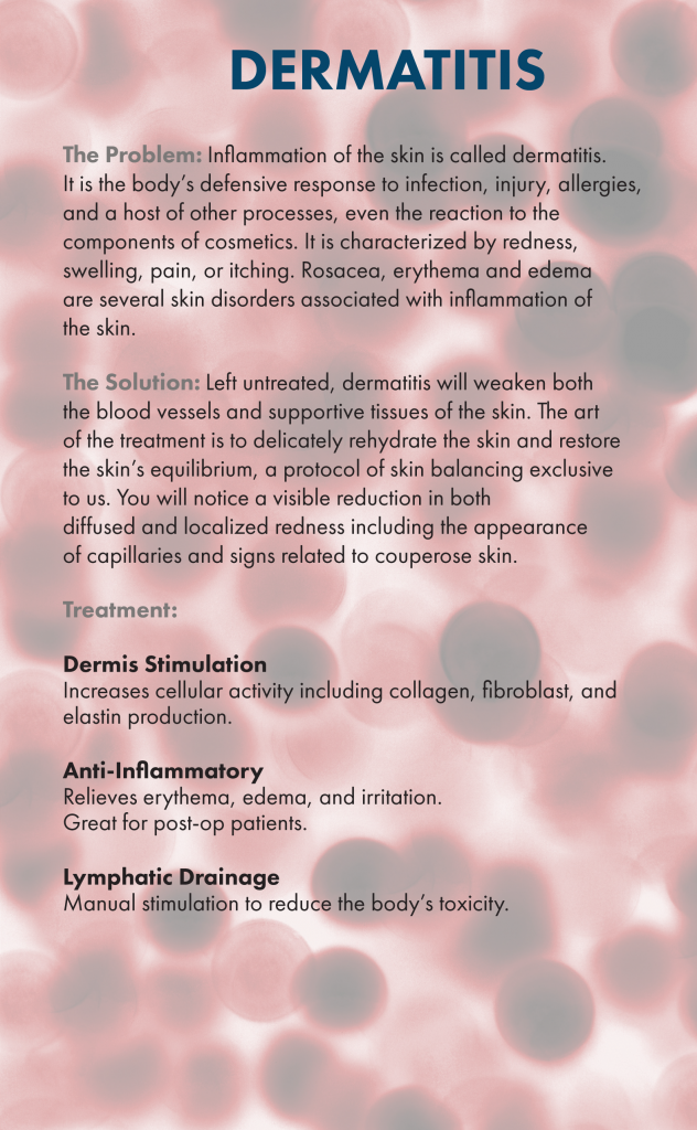 Left untreated, dermatitis will weaken both the blood vessels and supportive tissues of the skin. The art of the treatment is to delicately rehydrate the skin and restore the skin’s equilibrium, a protocol of skin balancing exclusive to us. You will notice a visible reduction in both diffused and localized redness including the appearance of capillaries and signs related to couperose skin.